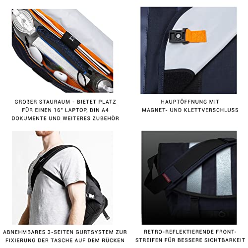 Beste bescherming: perfecte bescherming tegen vloeistoffen, vuil en stof dankzij de robuuste, waterafstotende materialen; gevoerd vak voor een laptop tot 16 inch en een tablet van 12,9 inch; retro-reflecterende frontstrepen voor betere zichtbaarheid en dus veiligheid op donkere wegen